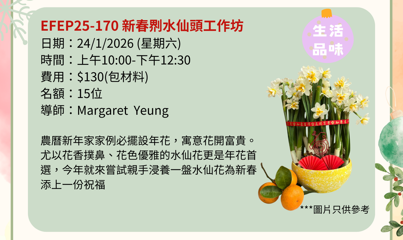 × EFEP25-170 新春鎅水仙頭工作坊 24/01/2026 日期:24/1/2026 (星期六) 時間:上午10:00-下午12:30 費用:$130(包材料) 名額:15位 導師:Margaret Yeung 農曆新年家家例必擺設年花,寓意花開富貴。 尤以花香撲鼻、花色優雅的水仙花更是年花首選,今年就來嘗試親手浸養一盤水仙花為新春添上一份祝福 上則 下則 分享至