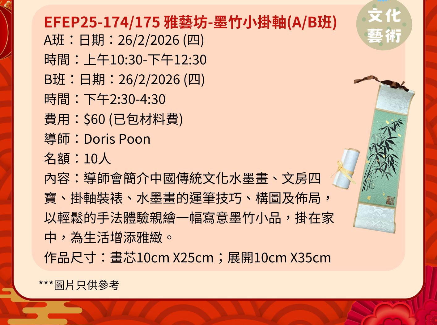 × EFEP25-174/175 雅藝坊-墨竹小掛軸(A班)(B班) 26/02/2026 A班:日期:26/2/2026 (四) 時間:上午10:30-下午12:30 B班:日期:26/2/2026 (四) 時間:下午2:30-4:30 費用:$60 (已包材料費) 導師:Doris Poon 名額:10人 地點:耆康會陳登匯駿天地(油麻地東莞街16號駿發花園第二期地下I舖) 內容:導師會簡介中國傳統文化水墨畫、文房四寶、掛軸裝裱、水墨畫的運筆技巧、構圖及佈局,以輕鬆的手法體驗親繪一幅寫意墨竹小品,掛在家中,為生活增添雅緻。 作品尺寸:畫芯10cm X25cm;展開10cm X35cm 下則 分享至