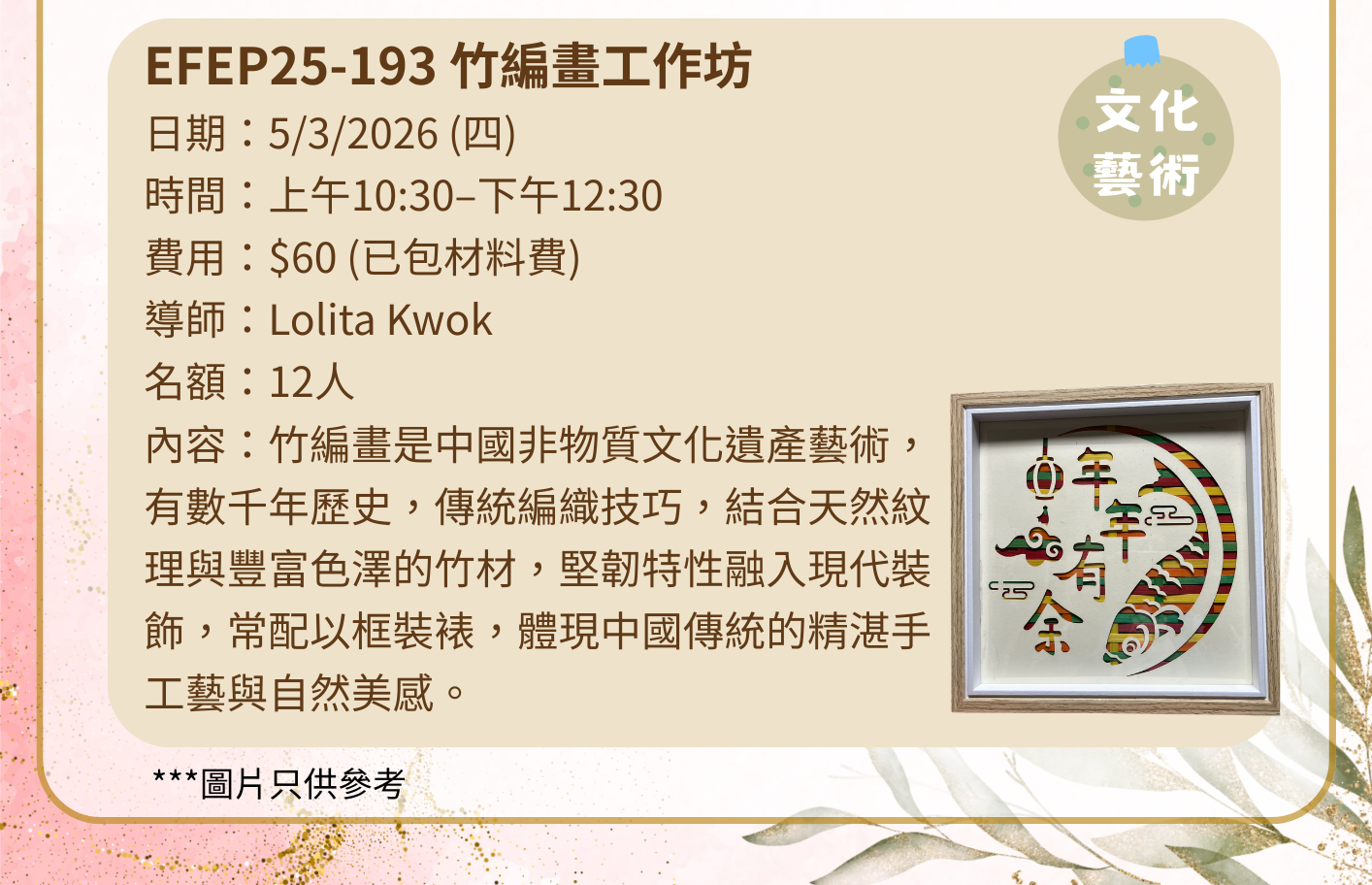 × EFEP25-193 竹編畫工作坊 05/03/2026 日期:5/3/2026 (四) 時間:上午10:30‒下午12:30 費用:$60 (已包材料費) 導師:Lolita Kwok 名額:12人 內容:竹編畫是中國非物質文化遺產藝術, 有數千年歷史,傳統編織技巧,結合天然紋 理與豐富色澤的竹材,堅韌特性融入現代裝 飾,常配以框裝裱,體現中國傳統的精湛手 工藝與自然美感。 上則 下則 分享至