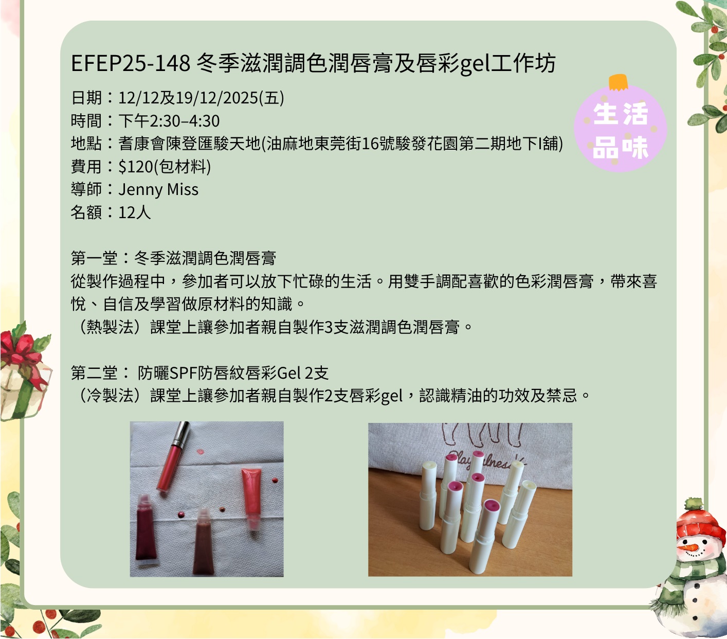 × EFEP25-148 冬季滋潤調色潤唇膏及唇彩gel工作坊 12/12/2025 日期:12/12及19/12/2025(五) 時間:下午2:30–4:30 地點:耆康會陳登匯駿天地(油麻地東莞街16號駿發花園第二期地下I舖) 費用:$120(包材料) 導師:Jenny Miss 名額:12人 第一堂:冬季滋潤調色潤唇膏 從製作過程中,參加者可以放下忙碌的生活。用雙手調配喜歡的色彩潤唇膏,帶來喜悅、自信及學習做原材料的知識。 (熱製法)課堂上讓參加者親自製作3支滋潤調色潤唇膏。 第二堂: 防曬SPF防唇紋唇彩Gel 2支 (冷製法)課堂上讓參加者親自製作2支唇彩gel,認識精油的功效及禁忌。 上則 下則 分享至