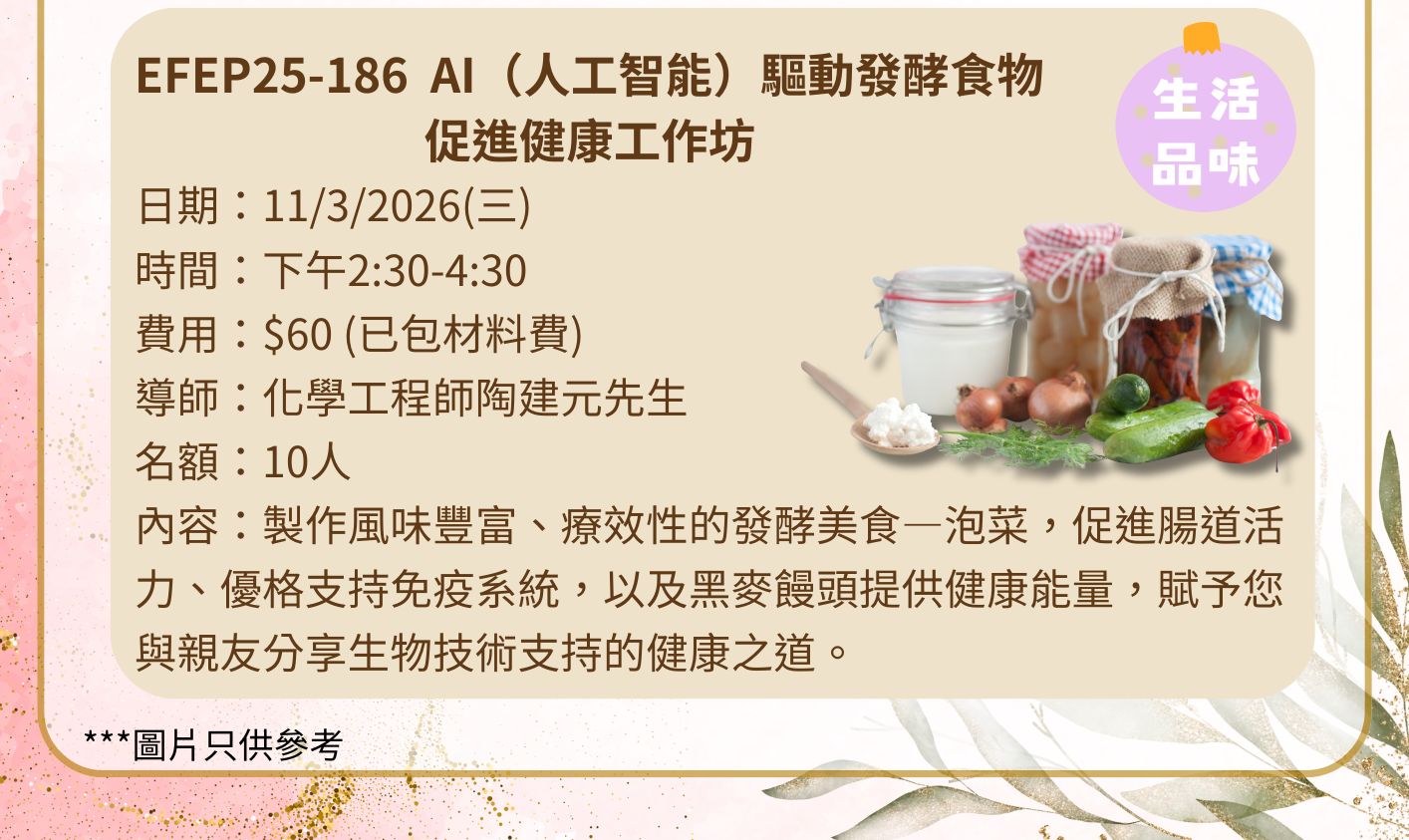 × EFEP25-186 AI(人工智能)驅動發酵食物促進健康工作坊 11/03/2026 日期:11/3/2026(三) 時間:下午2:30 - 4:30 地點:耆康會陳登匯駿天地(油麻地東莞街16號駿發花園第二期地下I舖) 費用:$60 (已包材料費) 導師:化學工程師陶建元先生 名額:10人 內容: 參加實作工作坊,製作風味豐富、療效性的發酵美食—泡菜,促進腸道活力、優格支持免疫系統,以及黑麥麵包提供健康能量,賦予您與親友分享生物技術支持的健康之道。 上則 下則 分享至
