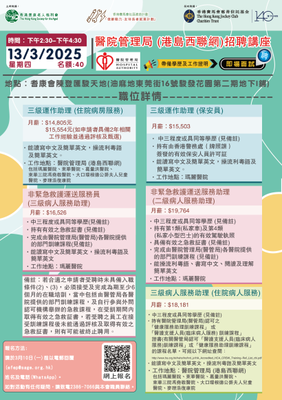 「傲齡創『耆』職招聘會」實體行情招聘講座 本計劃於2025年3月12日至14日舉辦「傲齡創『耆』職招聘會」,邀請8間公司現場舉辦「實體行情招聘講座」,提供不同職位空缺予50+中高齡人士申請 ! 馬上報名:https://forms.gle/iNcHLXgSH5mFNk5t8 ------------------------------- 實體行情招聘講座時間表: 3月12日(三)︱上午10:00︱十全保安有限公司 3月12日(三)︱下午2:30︱祥益地產代理有限公司 3月12日(三)︱下午2:30︱亮志體育運動國際有限公司 3月13日(四)︱上午10:00︱富天澤管理及培訓有限公司 3月13日(四)︱下午2:30︱醫院管理局(港島西聯網) 3月14日(五)︱上午10:00︱宏力保安服務有限公司 3月14日(五)︱下午2:30︱TUV Rheinland Hong Kong Limited 3月14日(五)︱下午2:30︱偉邦物業管理有限公司 ------------------------------- 招聘會提供不同職位: 司機、客戶服務員、三級運作助理、保安員、文員、車長、物業顧問(兼職)等 -------------------------------