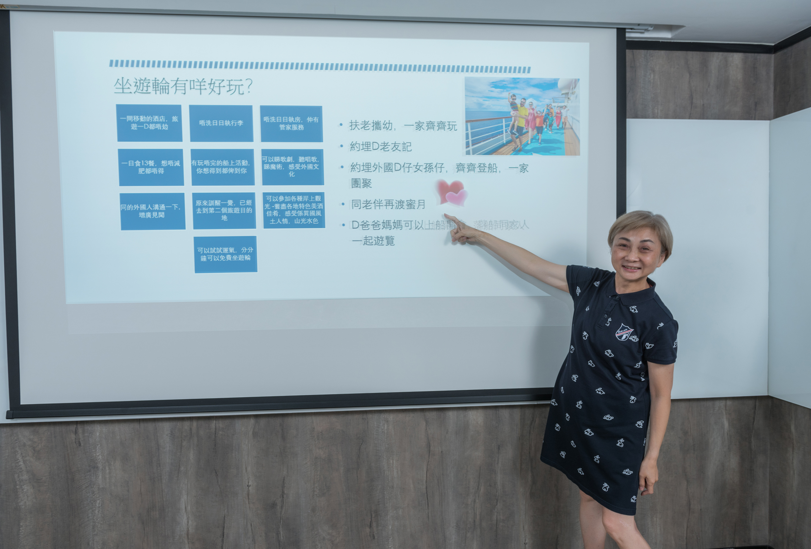 懷着郵輪旅遊豐富的知識及經驗,充滿熱誠的Melina希望與大眾分享及推廣郵輪旅遊的好處及注意事項。長者旅遊成為近年熱門的話題, 「傲齡動力-友待長者就業計劃」團隊特意邀請Melina到中心開設講座,分享有關郵輪旅遊的資訊與須知,讓長者認識更多旅遊的選項,樂活人生。